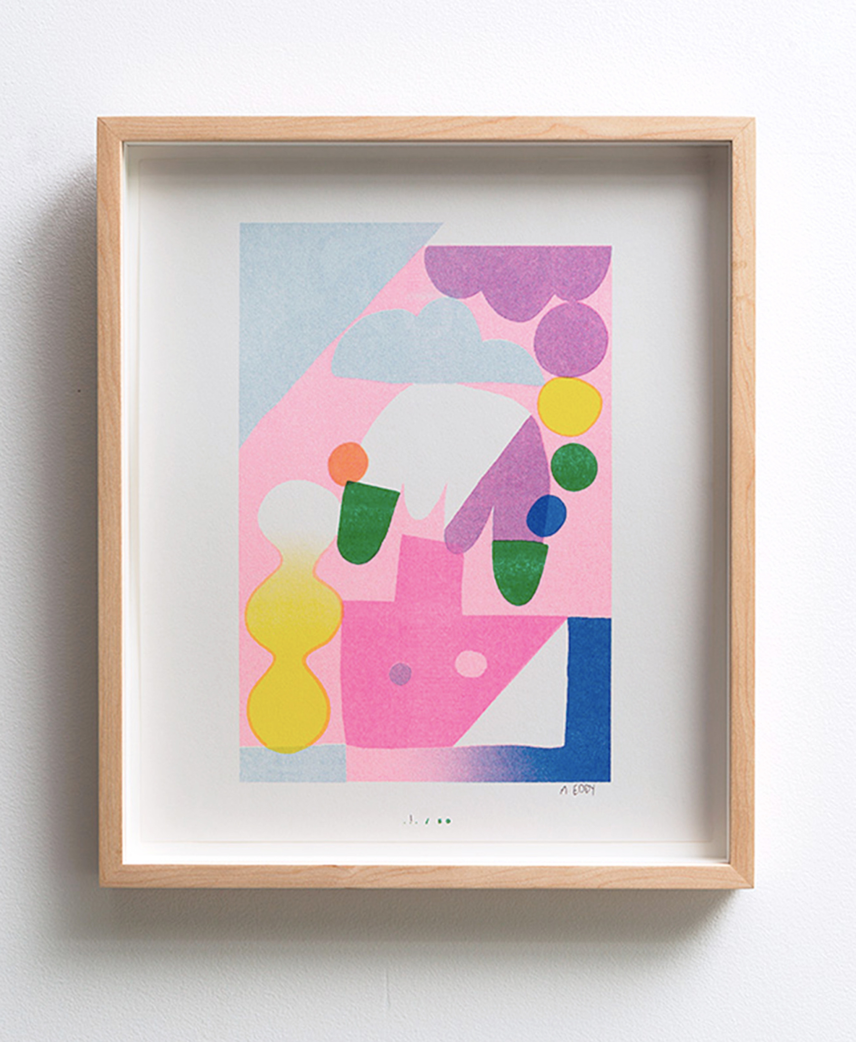 Four color Riso print on 280g uncoated paper. Mapple artist frame.